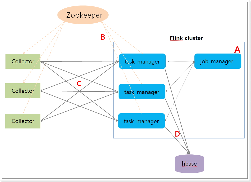 A. flink에 streaming job을 실행시킨다. B. job이 실행되면 taskmanager 서버의 정보가 zookeeper의 데이터 노드로 등록이 된다. C. Collector는 zookeeper에서 flink 서버의 정보를 가져와서 flink 서버와 tcp 연결을 맺고 agent stat 데이터를 전송한다. D. flink 서버에서는 agent 데이터를 집계하여 통계 데이터를 hbase에 저장한다.