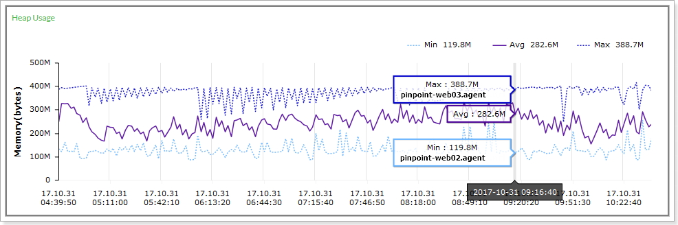 The Heap Usage chart above for example, shows the average(Avg), smallest(Min), greatest(Max) heap usage of the agents registered under the same application name along with the id of the agent that had the smallest/greatest heap usage at a certain point in time. The application inspector also provides other statistics found in the agent inspector in a similar fashion.