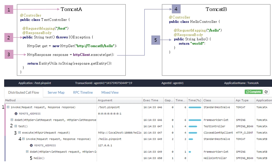 Figure 5 shows what you can see when you install Pinpoint in TomcatA and TomcatB. You can see the trace data of an individual node as a single transaction, which represents the flow of distributed transaction tracing.